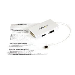StarTech.com Adaptador Conversor de Mini DisplayPort a VGA DVI o HDMI - Convertidor A/V 3 en 1 para viajes - Blanco. Longitud de cable: 0,15 m, Conector 1: Mini DisplayPort, Conector 2: DVI-D + VGA (D-Sub) + HDMI. Certificados de sostenibilidad: RoHS. Peso: 57 g, Ancho: 45 mm, Profundidad: 270 mm. Cantidad por paquete: 1 pieza, Ancho del paquete: 200 mm, Profundidad del paquete: 220 mm