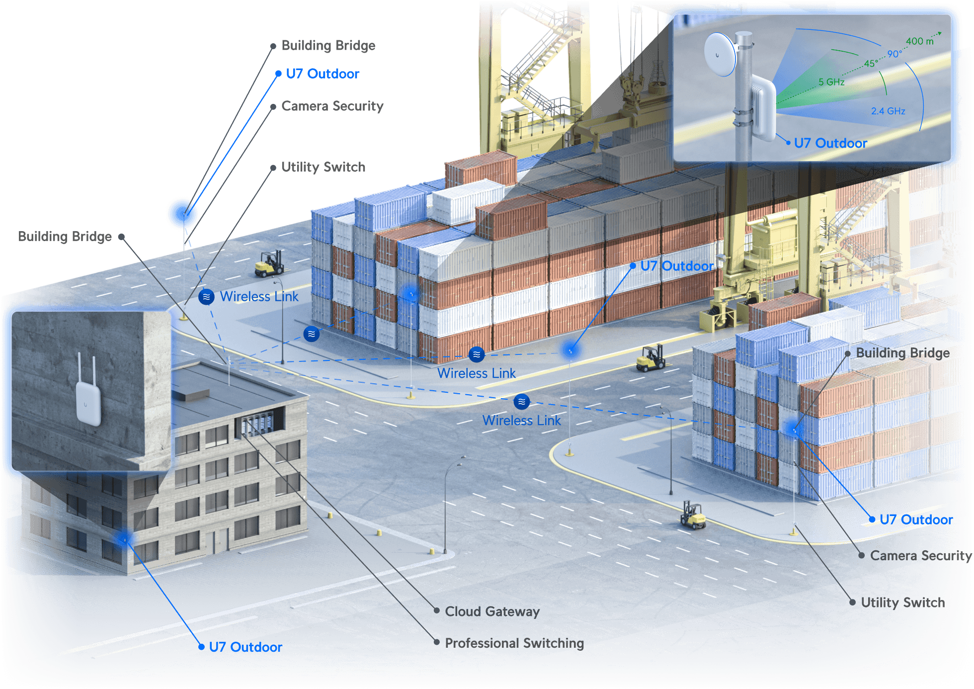 Cobertura de espacio abierto de 465 m² (5000 ft²) con la súper antena direccional integrada